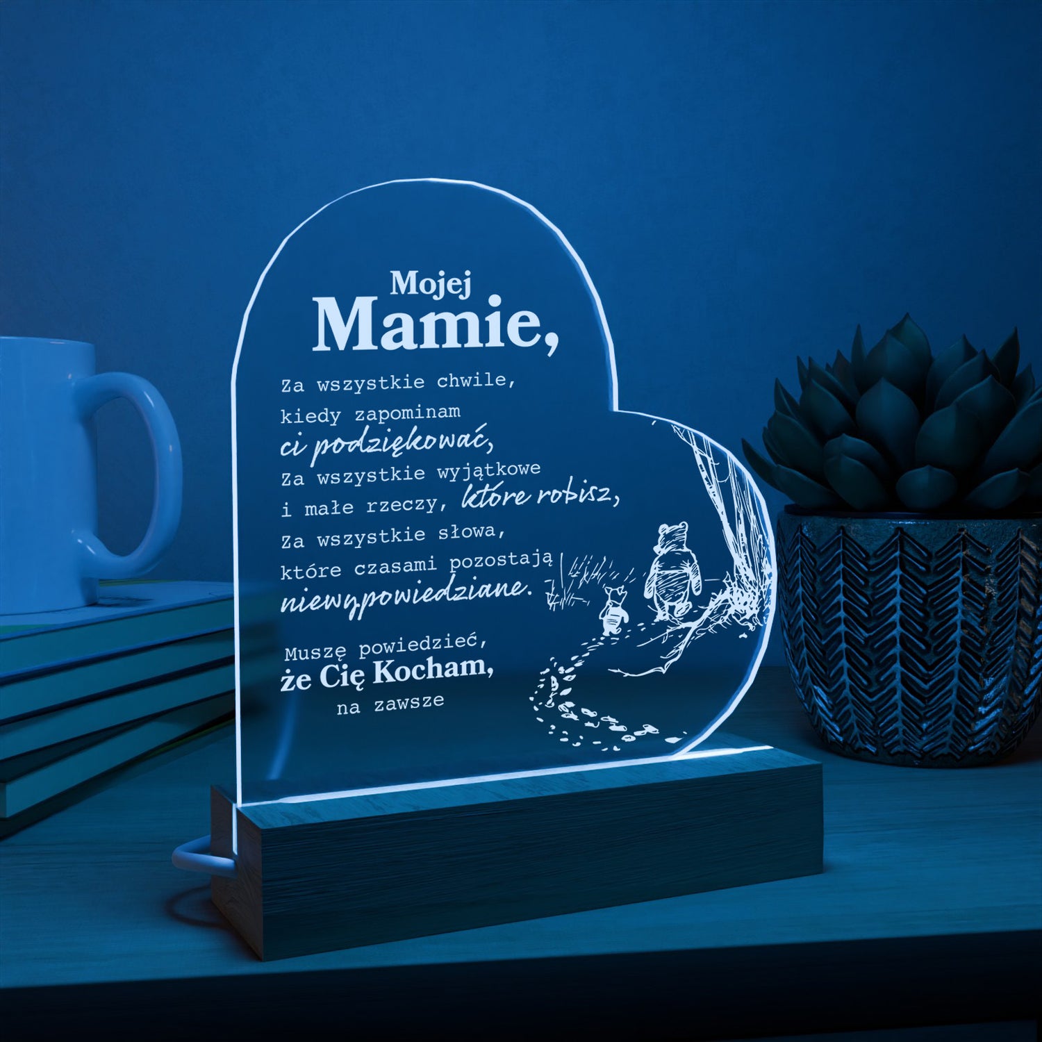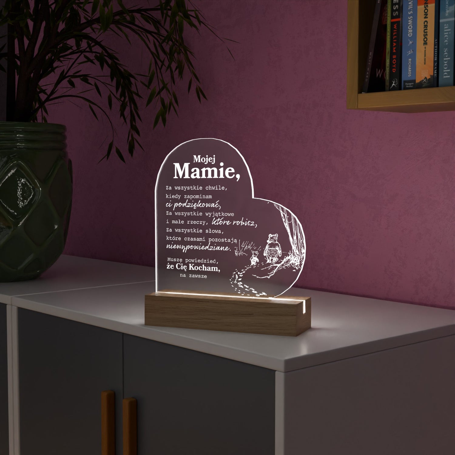 Szukasz wyjątkowego prezentu dla swojej mamy? Oto coś, co z pewnością wywoła u niej uśmiech i wzruszenie – ramka z podświetleniem LED i poruszającym serce grawerem. Ta elegancka ramka, osadzona na solidnej, drewnianej podstawce, to nie tylko ozdoba, ale również niezapomniane wspomnienie.