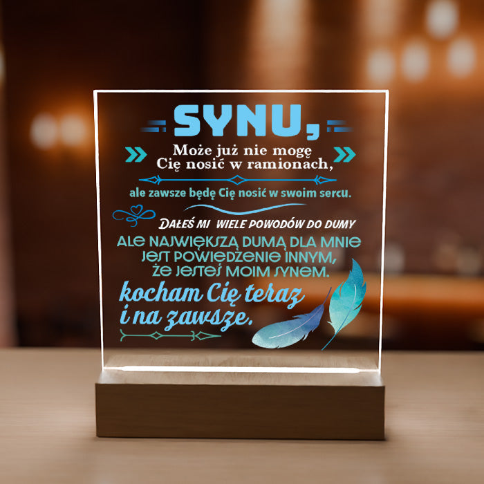 Szukasz wyjątkowego prezentu dla swojego syna? Oto coś, co z pewnością wywoła u niego uśmiech i wzruszenie – ramka z podświetleniem LED i poruszającym serce grawerem. Ta elegancka ramka, osadzona na solidnej, drewnianej podstawce, to nie tylko ozdoba, ale również niezapomniane wspomnienie.