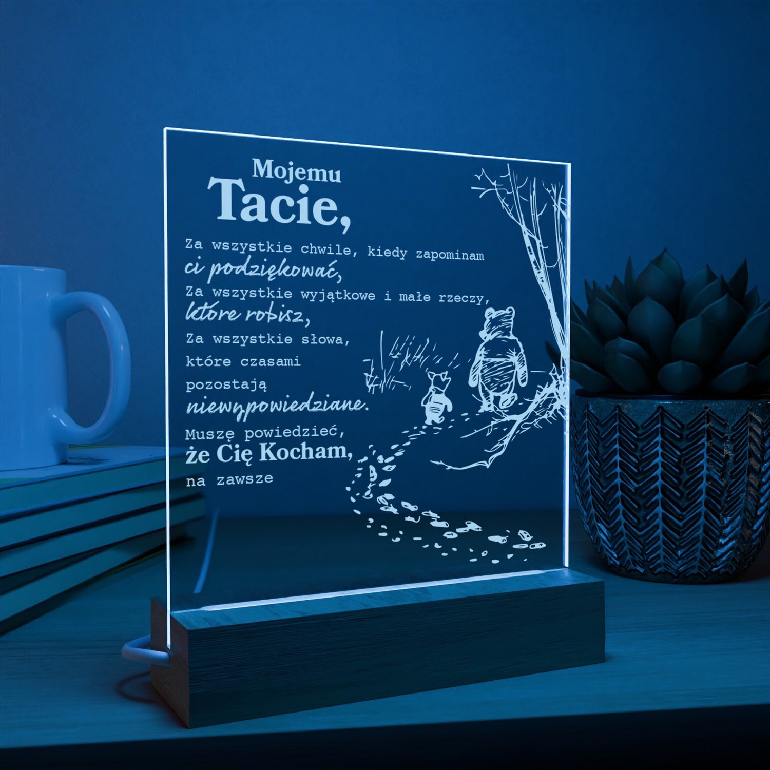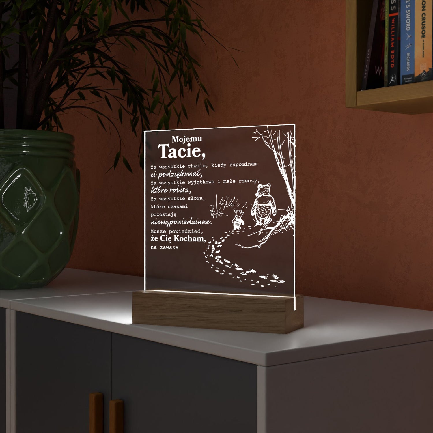 Szukasz wyjątkowego prezentu dla swojego taty? Oto coś, co z pewnością wywoła u niego uśmiech i wzruszenie – ramka z podświetleniem LED i poruszającym serce grawerem. Ta elegancka ramka, osadzona na solidnej, drewnianej podstawce, to nie tylko ozdoba, ale również niezapomniane wspomnienie.