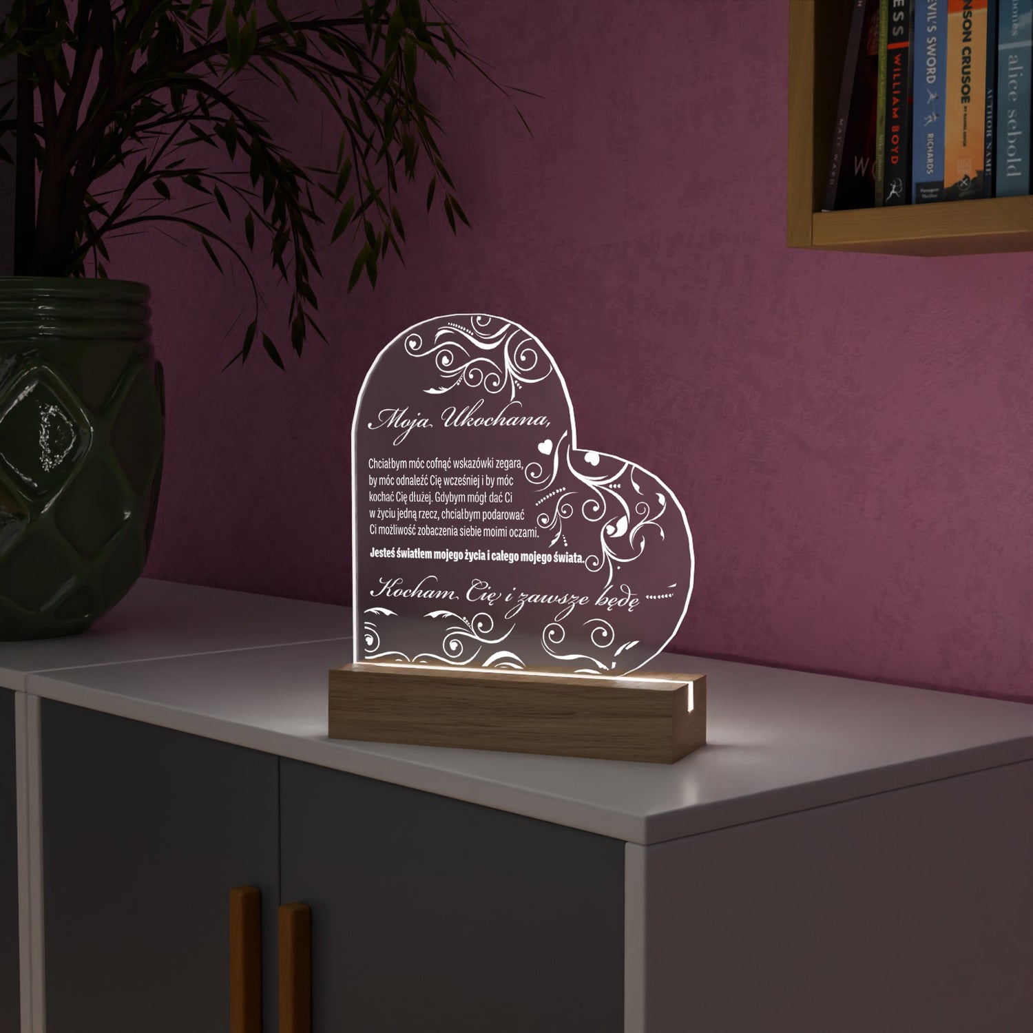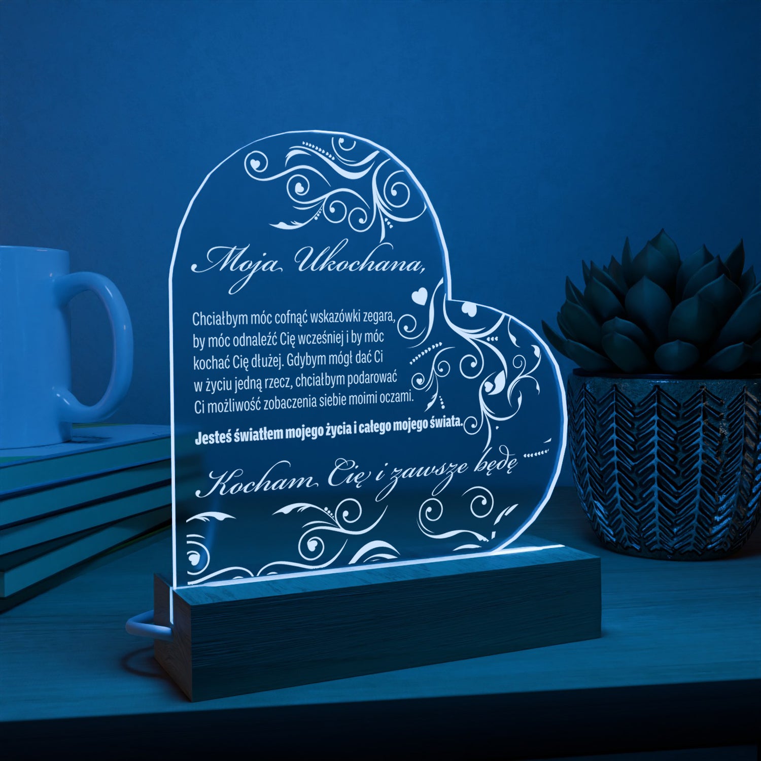 Szukasz wyjątkowego prezentu dla swojej ukochanej? Oto coś, co z pewnością wywoła u niej uśmiech i wzruszenie – ramka z podświetleniem LED i poruszającym serce grawerem. Ta elegancka ramka w kształcie serca, osadzona na solidnej, drewnianej podstawce, to nie tylko ozdoba, ale również niezapomniane wspomnienie.