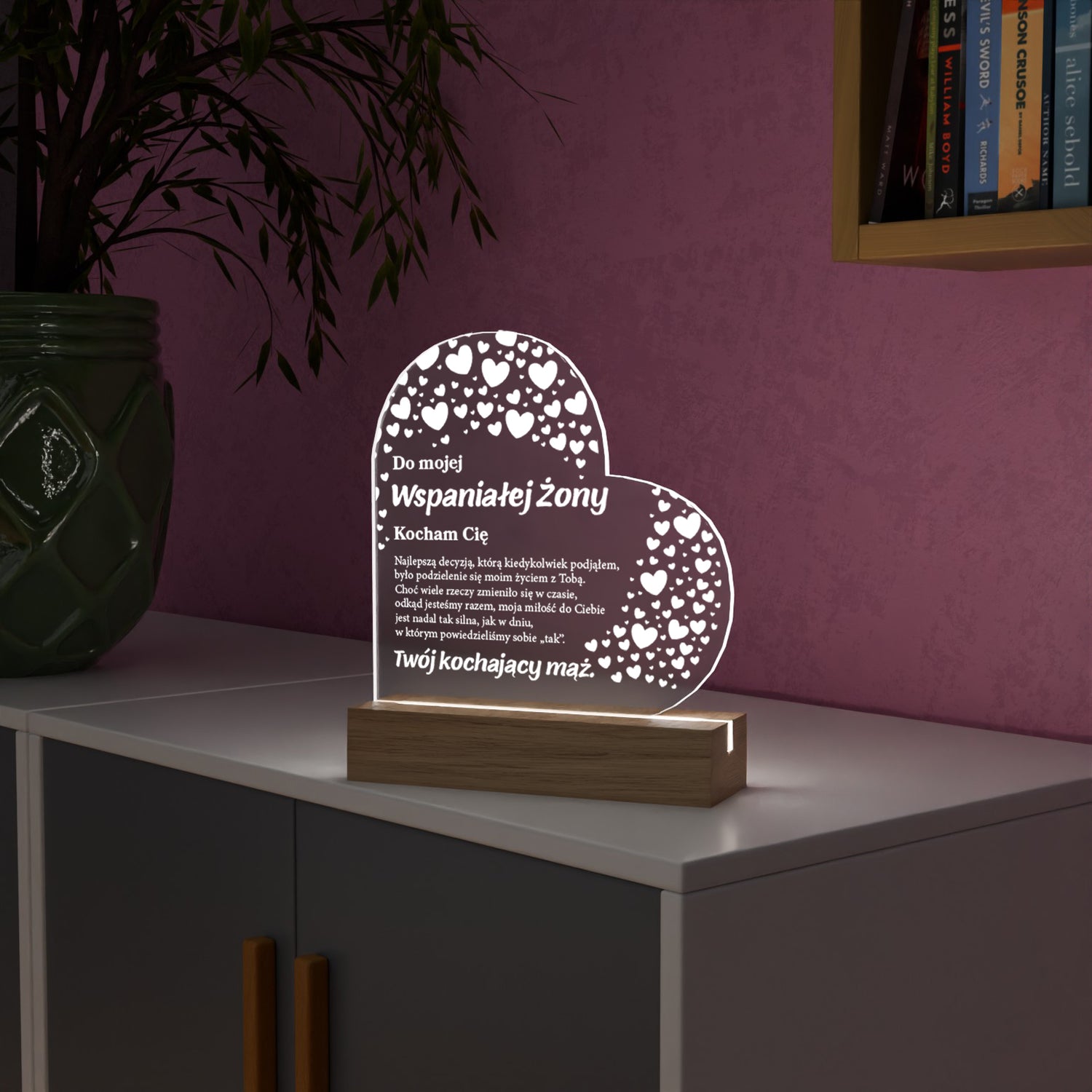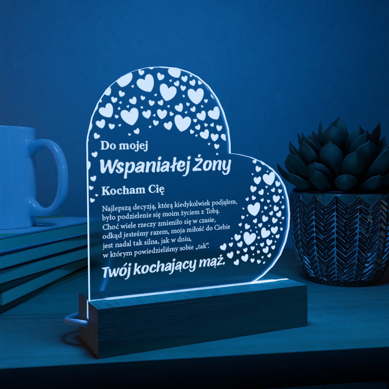Szukasz wyjątkowego prezentu dla swojej żony? Oto coś, co z pewnością wywoła u niej uśmiech i wzruszenie – ramka z podświetleniem LED i poruszającym serce grawerem. Ta elegancka ramka w kształcie serca, osadzona na solidnej, drewnianej podstawce, to nie tylko ozdoba, ale również niezapomniane wspomnienie.