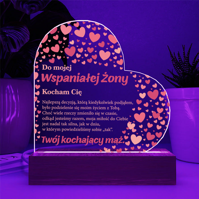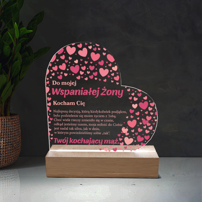 Szukasz wyjątkowego prezentu dla swojej żony? Oto coś, co z pewnością wywoła u niej uśmiech i wzruszenie – ramka z podświetleniem LED i poruszającym serce grawerem. Ta elegancka ramka w kształcie serca, osadzona na solidnej, drewnianej podstawce, to nie tylko ozdoba, ale również niezapomniane wspomnienie.